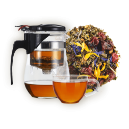Herbal mix tea combines bright and unique herbal and fruit taste. This is a 100% natural drink made from leaves, berries and fruits that do not contain caffeine and has a huge supply of vitamins, minerals and other valuable properties.